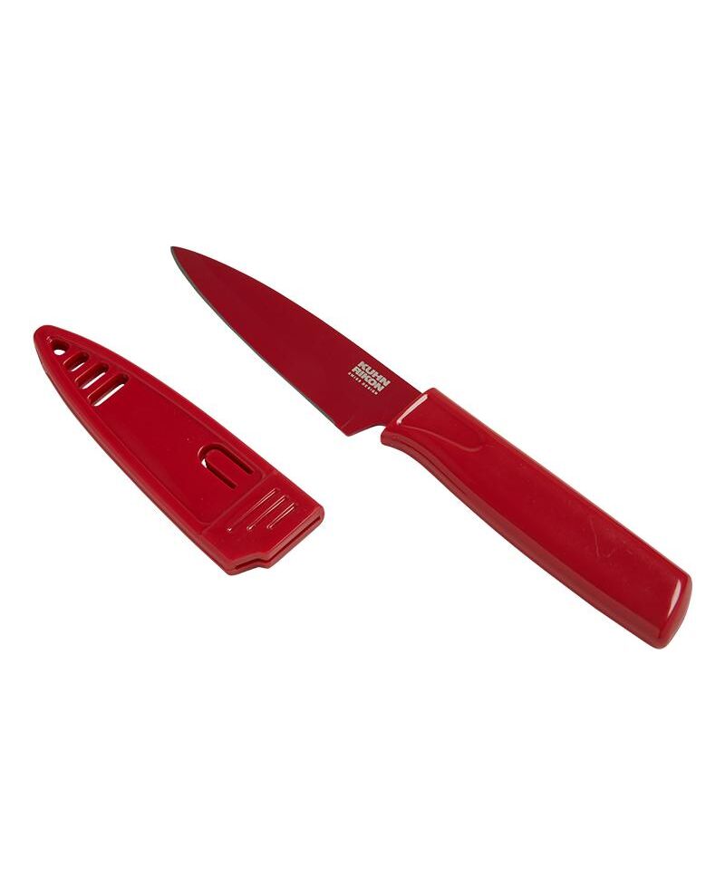 A must-have tool for any chef, novice or professional. The small, maneuverable blade is great for peeling, trimming or slicing fruits and vegetables. Japanese stainless steel blade is super sharp making tasks like coring tomatoes, zesting citrus or deveining shellfish faster and easier.Food releases easily from the nonstick blade. Safely transport to picnics and campsites with matching sheath.Available in a variety of colors, this handy knife makes a great gift for any cook.