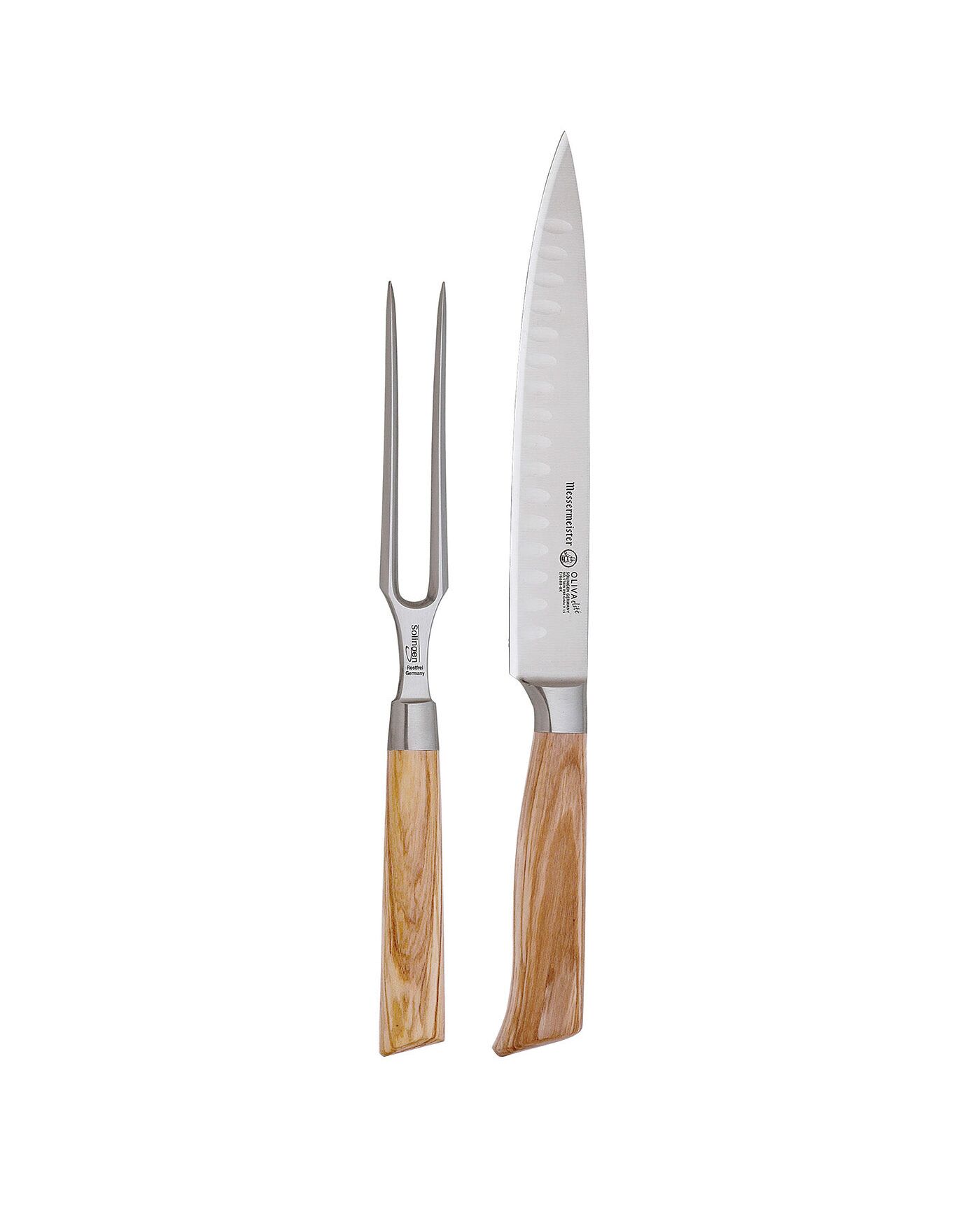 The Messermeister Oliva Elite Carving Set consists of an 8" Kullenschliff Carving Knife (E/6688-8K) and a 6" Straight Carving Fork (E/6805-6).This is the perfect addition to your cutlery collection. Impress your guests by carving large roasts and poultry with this beautifully crafted carving set.