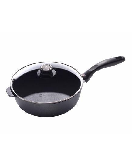 The Swiss Diamond 3.2 Quart Saute Pan is constructed of squeeze cast aluminum and features a patented diamond reinforced coating which conducts heat better than metals, adds strength to the surface, and cleans up quickly and effortlessly. The sloped sides and flat bottom make the Swiss Diamond fry pan perfect for sauteing, frying, and browning, and the pan is oven safe to 500° F. Made in Switzerland, limited lifetime warranty.