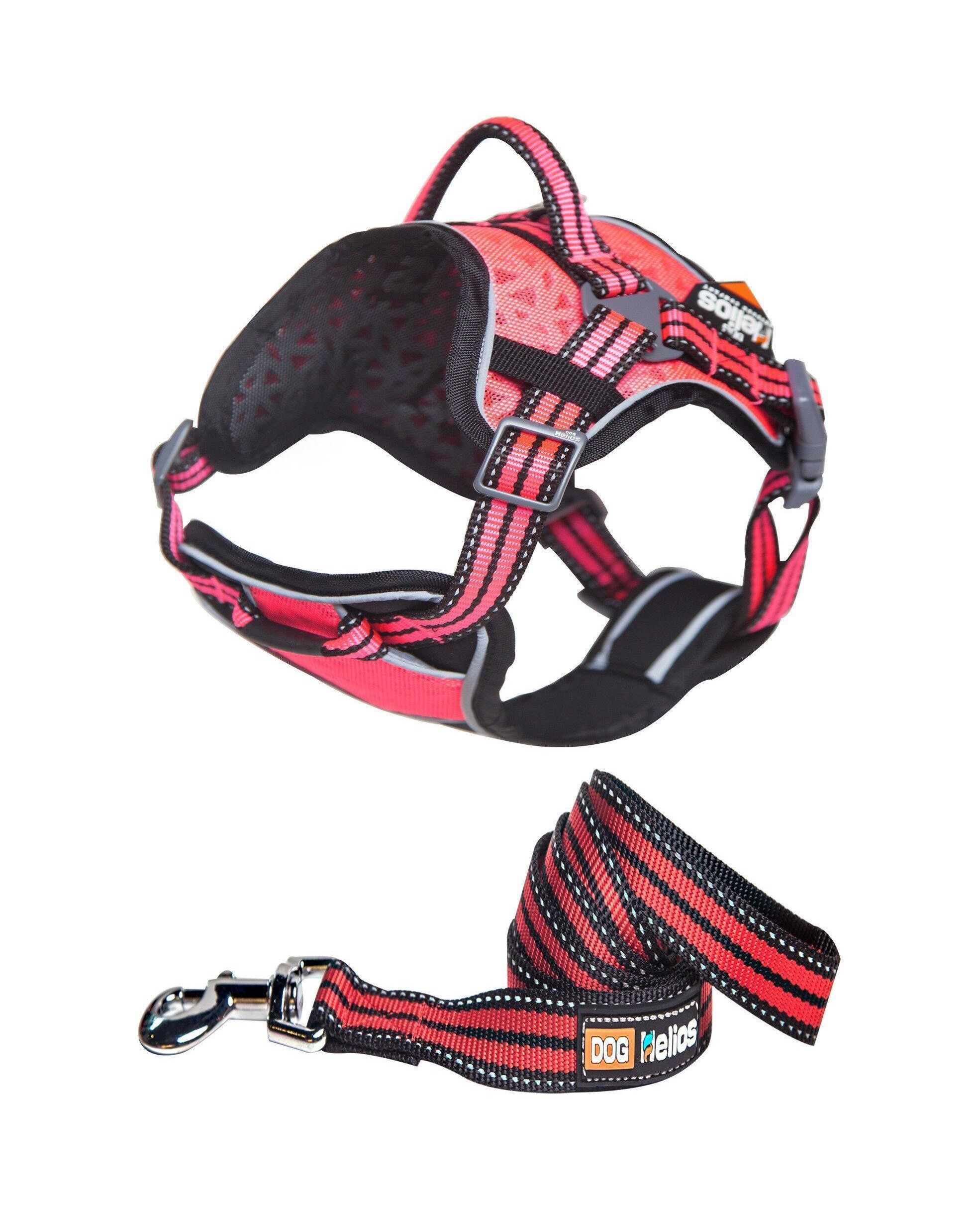 The Dog Helios ® 'Journey Wander' Chest Compressive Sporty Adjustable Dog Harness and Leash is composed of a Durable Reflective 600 Denier Nylon and Mesh Outer-shell. This unique construction enables both the top and bottom portions of these dog harnesses adjust according to chest girth. Features durable buckles with Dual Pull Handles both at the top and by the chest area. Places pressure at the sternum of the chest area for added comfort while walking your pet on all surface areas while placing less pressure at the proper locations by the Chest area. The exterior features reflective embedded mesh technology with added Outer-rimmed 3M Reflective Tubing for added safety during those night strolls. Comes with an accented reflective stitched Leash with a Titanium swivel hook connector. Features both Rubberized Embroidered hand stitching on both the Leash and Harness. Get Outdoors with Helios Dog! Available in Multiple Sizes and Colors. Sizing Guide (INCHES) HARNESS DIMENSIONS - SMALL - BACK - 2.75 CHEST - 17.7 - 22.8 NECK - 15.7 - 18.8 MEDIUM - BACK - 3.54 CHEST - 21.6 - 27.5 NECK - 19.7 - 24.4 LARGE - BACK - 4.72 CHEST - 24.4 - 33.8 NECK - 26.7 - 34.6 LEASH DIMENSIONS - SMALL - LENGTH - 4 FEET, THICKNESS - 0.27 In MEDIUM - LENGTH - 4 FEET, THICKNESS - 0.35 In LARGE - LENGTH - 4 FEET, THICKNESS - 0.51 In