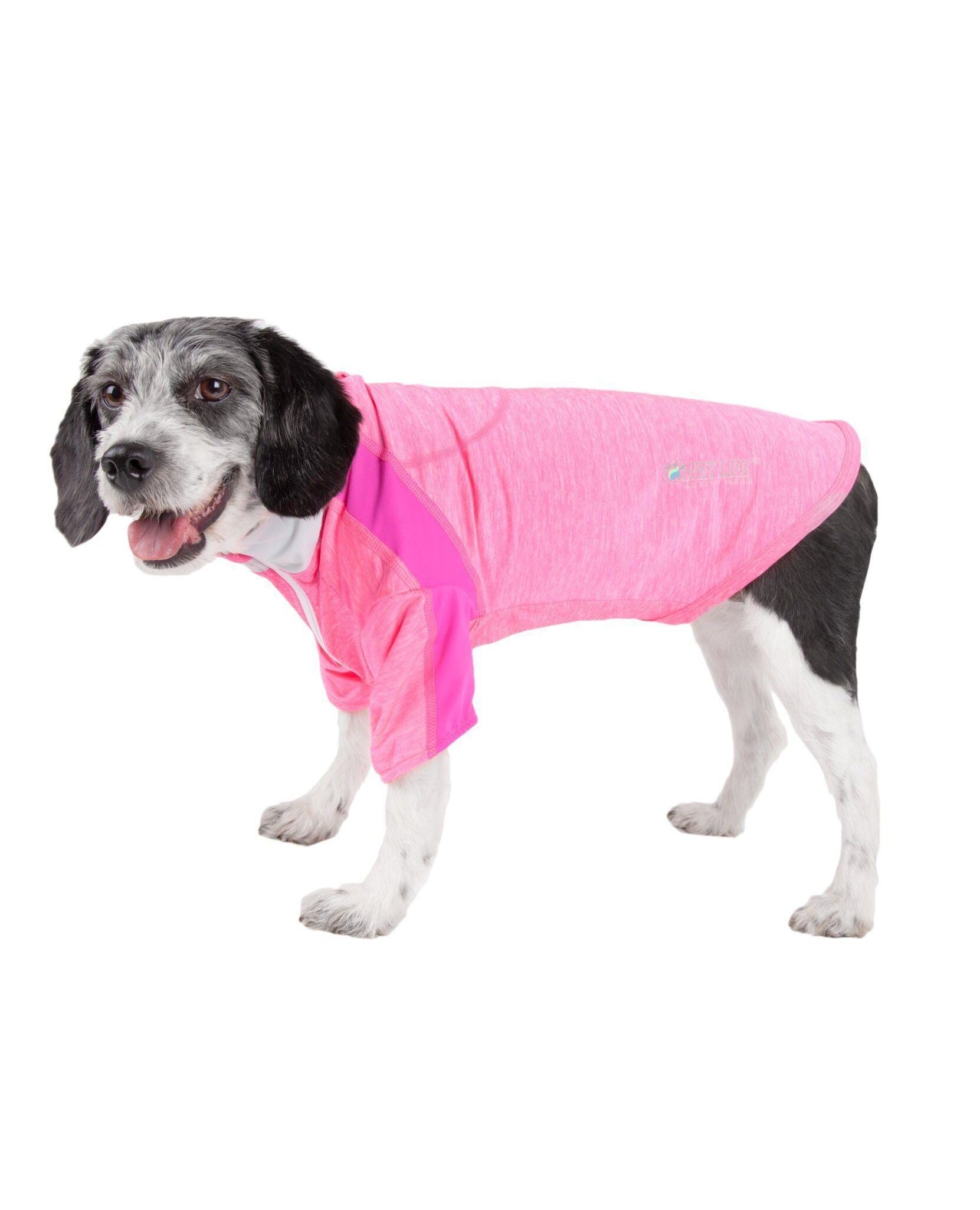 The Pet Life ® Active 'Chewitt Wagassy' 4-Way-Stretch Yoga Fitness Long-Sleeve Dog T-Shirt features specially engineered Stretchy fabric that are Lightweight and Permeable resulting in a well Ventilated system that is specially developed to maximize Mobility and Breath-ability. Features 4-Way Stretch Technology that moves better in every direction with a customized relaxed fit without the squeeze and won't bunch up. The side of the body and arms feature a lighter blend of fabric for strategic ventilation. Features Quick-Drying properties that dries extremely fast while offering Anti-Odor technology that prevents odor causing microbes. The Chewitt-Wagassy Long Sleeve T-shirt also offers UV Protectaion against the suns harmful rays and fitted perfectly to help assist in containment or collection of shedded hairs. This Dog T-shirt is perfect for performance fitness and outdoor dog yoga Activities. Features Dual Reinforced stitching at every seam for durability with a convenient zippered design with protective zipper flaps preventing the pet's hairs from getting caught within the zipper tracks. Additionally this T features Reflective Taping for added night visibility and a Leash Slit along the back. Machine Washable. This style is part of our Pet Life ® Activewear Collection. Available in Multiple Sizes and Colors. SIZING SPECIFICATIONS - In (Inches) "Back" Length is from Neck to Tail - * See image chart for sizing approximation EXTRA SMALL - Back - 9.5" Chest - 13.5" Neck - 12.5" Sleeve - 4.5" SMALL - Back - 11.5" Chest - 16.5" Neck - 13.5" Sleeve - 5 MEDIUM - Back - 15" Chest - 20.5" Neck - 15.5" Sleeves - 5.5" LARGE - Back - 18.9" Chest - 25.5" Neck - 17.3" Sleeve - 6.1" EXTRA LARGE - Back - 22" Chest - 30.5" Neck - 19.8" Sleeve - 7"