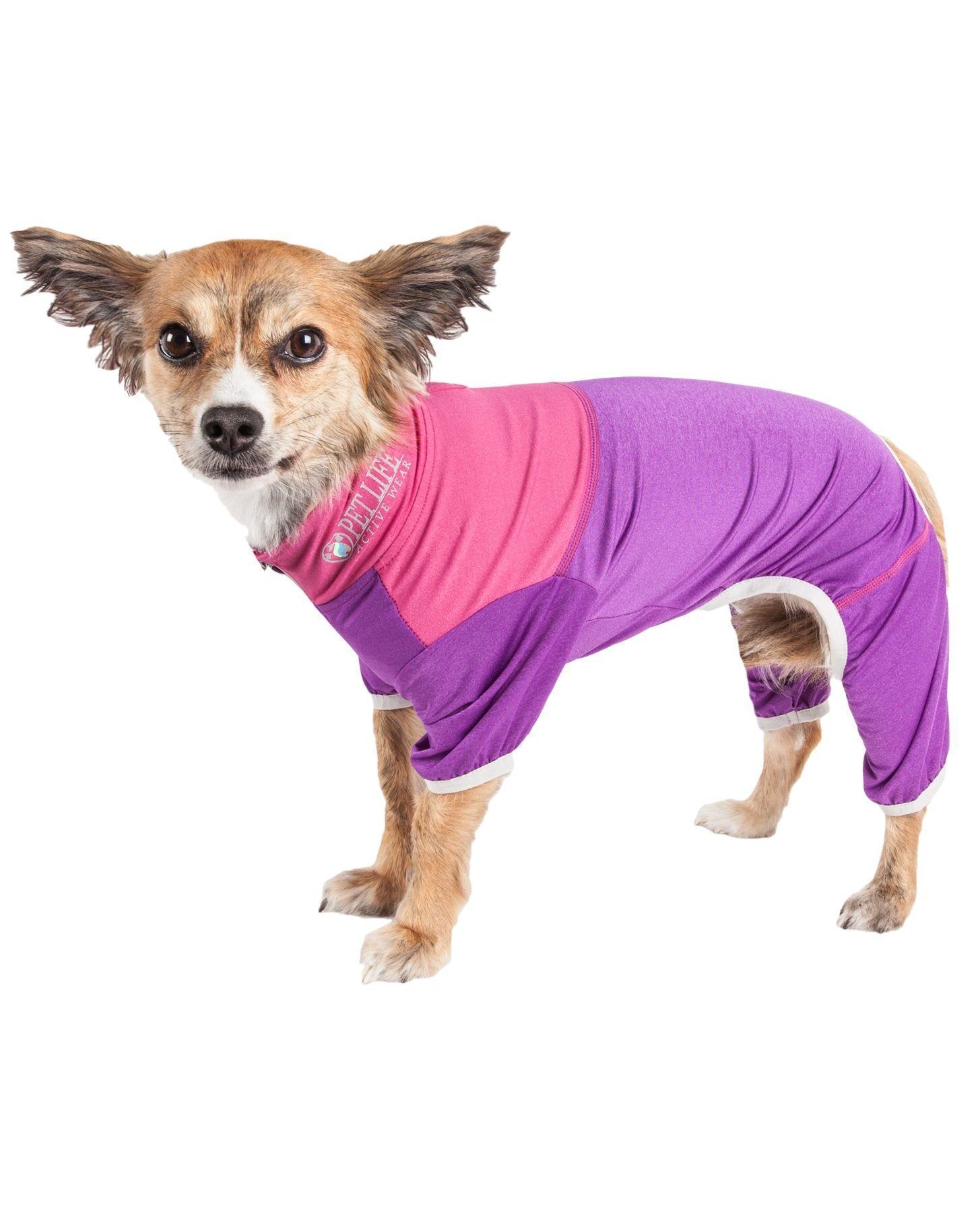 The Pet Life ® Active 'Embarker' 4-Way Stretch Fitness Yoga Full Body Dog Tracksuit is Next-Generation performance unleashed. Features a specially formulated Ultra-Lightweight Micro-knit system that maintains body temperature and features 4-way Stretch technology that moves better in every direction for premium comfort and mobility with strategic ventilation points for Breath-ability. Perfect for Performance Fitness and Dog Yoga Activities. Features a tapered and streamlined fit that's also expandable with stretch-banded lining that extends additional room for growth. This fabric features Quick-Drying properties that repels perspiration and dries really fast while offering Anti-Odor technology that assists with odor causing microbes. Offers UV Protection against the suns harmful rays and fitted to help assist in containment or collection of shedded hairs. Design features Dual Reinforced stitching at every seam for Durability and a zipper for convenient on and off access with a zippered track protector preventing hairs from entrapment and a leash slit for easy on and off access. Features a sporty stretch collar fashion collar and Reflective Taping for added night visibility. Machine Washable. This style is part of our Pet Life ® Activewear Collection. Available in Multiple Sizes and Colors. SIZING SPECIFICATIONS - In (Inches) "Back" Length is from Neck to Tail - * See image chart for sizing approximation EXTRA SMALL - Back - 9" Chest - 14" Neck - 11.5" Sleeve - 4.4" SMALL - Back - 11" Chest - 17.4" Neck - 13" Sleeve - 4.8 MEDIUM - Back - 13.8" Chest - 20.5" Neck - 14.5" Sleeves - 5.5" LARGE - Back - 17.8" Chest - 25" Neck - 16.8" Sleeve - 6.6" EXTRA LARGE - Back - 22.5" Chest - 31" Neck - 19" Sleeve - 7.6"