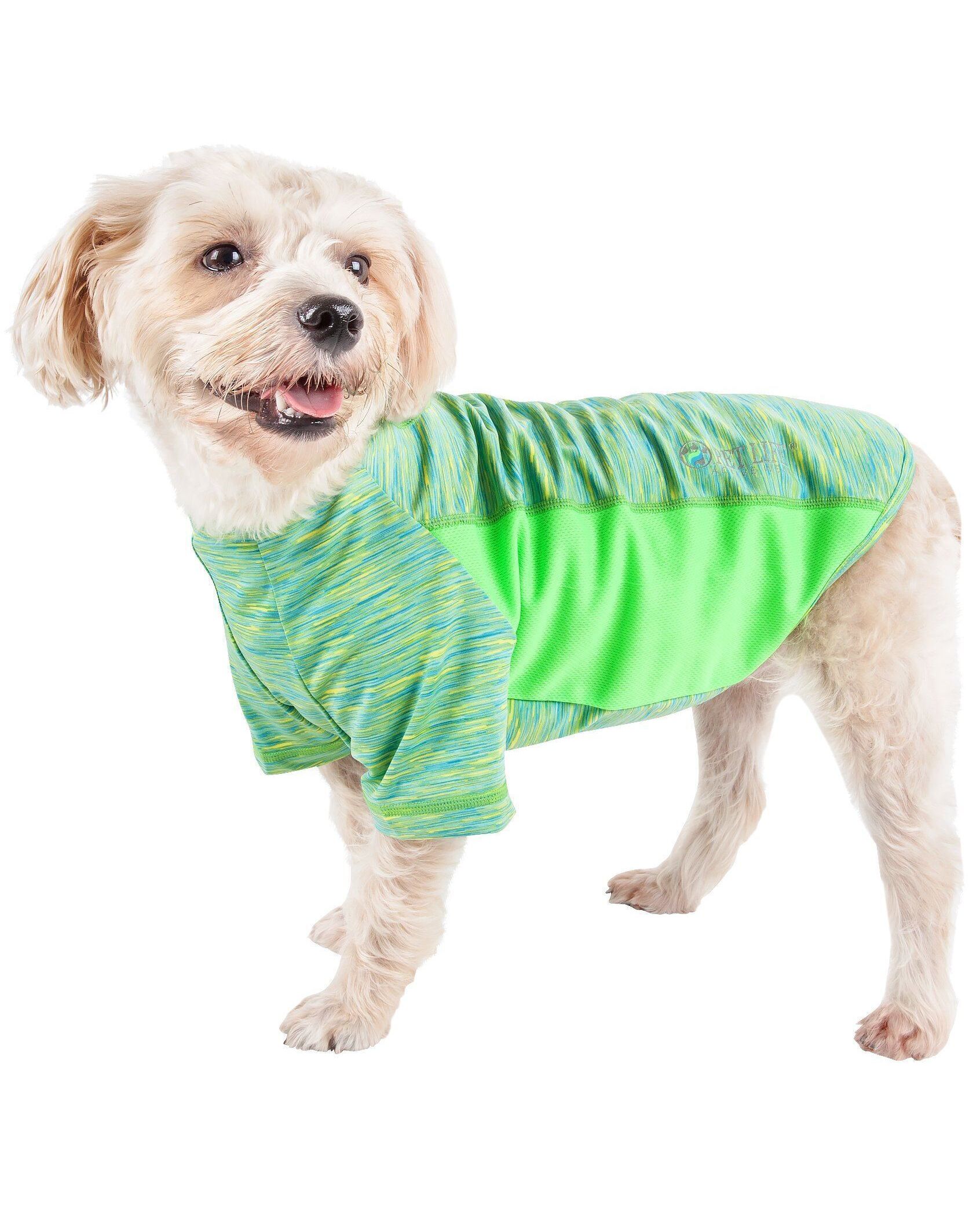 The Pet Life ® Active 'Warf Speed' Heathered Ultra-Stretch Yoga Fitness Dog T-Shirt features a Dog Yoga complex performance structure comprised of premium blended stretchy fabrics with a sided strategic ventilation system with breathable Micro-panels that focus at the source of perspiration to help maximize Breath-ability during movement. Features 4-Way Stretch construction that moves better in every direction with a customized fit that's further than next to skin or Fur without the squeeze and won't bunch up. The top layer features a specially formulated stretchy elastic and breathable performance Micro-fibers that are also lightweight and stretchy. Features Quick-Drying properties that dries really fast that repels body moisture or sweat while offering Anti-Odor technology that assists with odor causing microbes. The Warf-Speed T-shirt also offers UV Protection against the suns harmful rays and fitted perfectly to help assist with containment of shedded hairs. Design features Dual Reinforced stitching at every seam for longevity and durability with a Pull-over design for easy on and off access and Reflective-Taping for added night visibility. Machine Washable. This style is part of our Pet Life ® Activewear Collection. Available in Multiple Sizes and Colors. SIZING SPECIFICATIONS - In (Inches) "Back" Length is from Neck to Tail - * See image chart for sizing approximation. EXTRA SMALL - Back - 9.5" Chest - 13.5" Neck - 9.5" Sleeve - 6.5" SMALL - Back - 11.5" Chest - 16.5" Neck - 12.5" Sleeve - 7" MEDIUM - Back - 14.5" Chest - 20.5" Neck - 14" Sleeves - 7.5" LARGE - Back - 18.5" Chest - 25.5" Neck - 16.5" Sleeve - 8" EXTRA LARGE - Back - 21.5" Chest - 30.5" Neck - 19.5" Sleeve - 8.8"