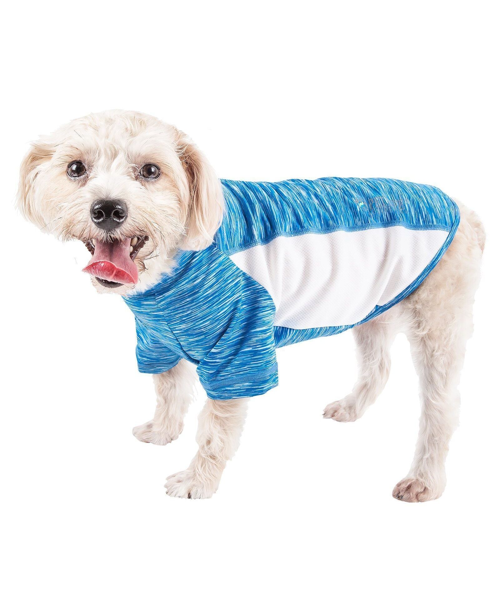 The Pet Life ® Active 'Warf Speed' Heathered Ultra-Stretch Yoga Fitness Dog T-Shirt features a Dog Yoga complex performance structure comprised of premium blended stretchy fabrics with a sided strategic ventilation system with breathable Micro-panels that focus at the source of perspiration to help maximize Breath-ability during movement. Features 4-Way Stretch construction that moves better in every direction with a customized fit that's further than next to skin or Fur without the squeeze and won't bunch up. The top layer features a specially formulated stretchy elastic and breathable performance Micro-fibers that are also lightweight and stretchy. Features Quick-Drying properties that dries really fast that repels body moisture or sweat while offering Anti-Odor technology that assists with odor causing microbes. The Warf-Speed T-shirt also offers UV Protection against the suns harmful rays and fitted perfectly to help assist with containment of shedded hairs. Design features Dual Reinforced stitching at every seam for longevity and durability with a Pull-over design for easy on and off access and Reflective-Taping for added night visibility. Machine Washable. This style is part of our Pet Life ® Activewear Collection. Available in Multiple Sizes and Colors. SIZING SPECIFICATIONS - In (Inches) "Back" Length is from Neck to Tail - * See image chart for sizing approximation. EXTRA SMALL - Back - 9.5" Chest - 13.5" Neck - 9.5" Sleeve - 6.5" SMALL - Back - 11.5" Chest - 16.5" Neck - 12.5" Sleeve - 7" MEDIUM - Back - 14.5" Chest - 20.5" Neck - 14" Sleeves - 7.5" LARGE - Back - 18.5" Chest - 25.5" Neck - 16.5" Sleeve - 8" EXTRA LARGE - Back - 21.5" Chest - 30.5" Neck - 19.5" Sleeve - 8.8"