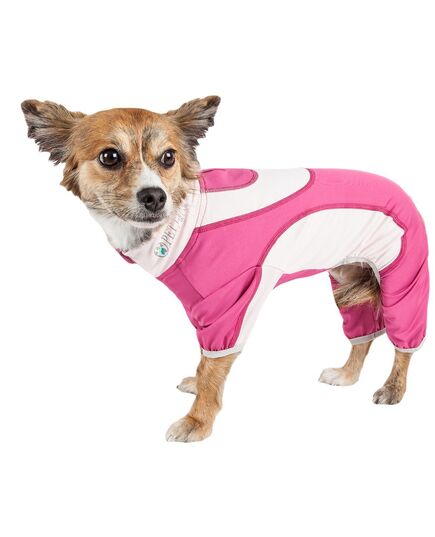 The Pet Life ® Active 'Warm-Pup' Stretchy and Quick-Drying Fitness Dog Yoga Warm-Up Tracksuit is Next-Generation performance unleashed. Features a specially formulated Ultra-Lightweight Micro-knit system that maintains body temperature and features 4-way Stretch technology that moves better in every direction for premium Comfort and Mobility with strategic ventilation points for Breath-ability. Perfect for Performance Fitness and Dog Yoga activities, Features a tapered and streamlined fit that's also expandable with stretch-banded lining that extends additional room for growth. This fabric features Quick-Drying properties that repels perspiration and dries really fast while offering Anti-Odor technology that assists with odor causing microbes. Offers UV Protection against the suns harmful rays and fitted to help assist in containment or collection of shedded hairs. Design features Dual Reinforced stitching at every seam for durability and a leash-slit along the backside, a fashion collar and a zipper underneath for convenient on and off access with Reflective Taping for added night visibility. Machine Washable. This style is part of our Pet Life ® Activewear Collection. Available in Multiple Sizes and Colors. SIZING SPECIFICATIONS - In (Inches) "Back" Length is from Neck to Tail - * See image chart for sizing approximation EXTRA SMALL - Back - 9" Chest - 14" Neck - 11.5" Sleeve - 4.4" SMALL - Back - 11" Chest - 17.4" Neck - 13" Sleeve - 4.8 MEDIUM - Back - 13.8" Chest - 20.5" Neck - 14.5" Sleeves - 5.5" LARGE - Back - 17.8" Chest - 25" Neck - 16.8" Sleeve - 6.6" EXTRA LARGE - Back - 22.5" Chest - 31" Neck - 19" Sleeve - 7.6"