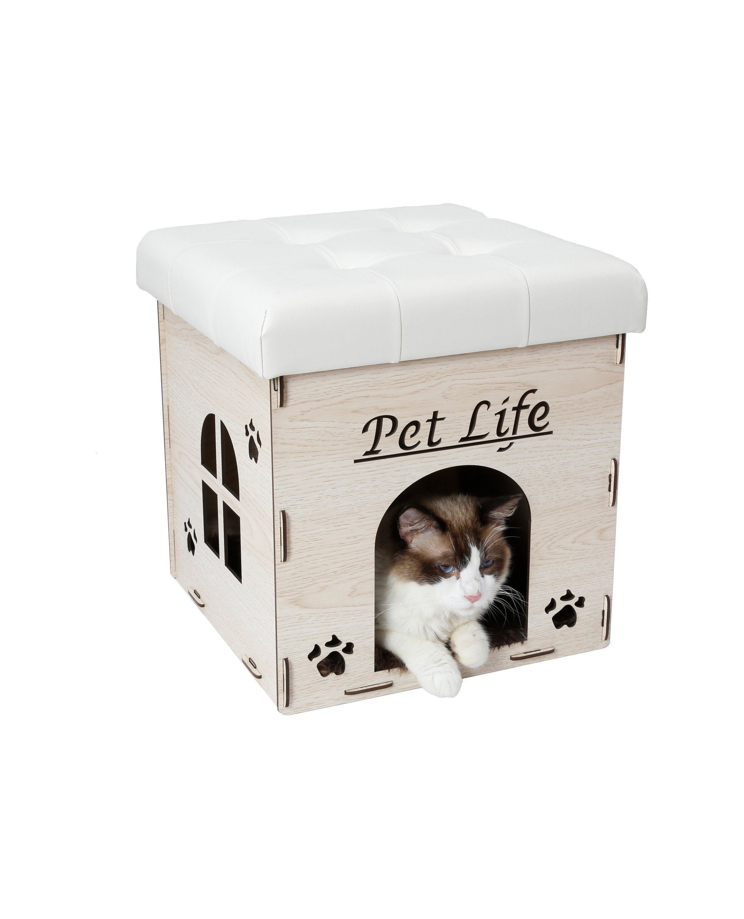 The Pet Life Foldaway collapsible Cat House Furniture bench easily assembles and collapses. Features a comfortable pleather cushion at the top useful for sitting on that can handle up to 300 lbs. of weight. Features playful designer carved entrance and windows great for light exposure or visibility. Comes with an ultra plush machine washable insert able polyester inner cushion great for lounging on. Great as a furniture piece and comes with multiple variation colorations to match and compliment the decor of any home. This cat ottoman is great for multiple usages. Designed for smaller dog breeds and cats. This Kitty Cat House is Available in Multiple Colors. SIZING MEASUREMENTS (INCHES) LxWxH - 15.74 x 15.74 x 17.23