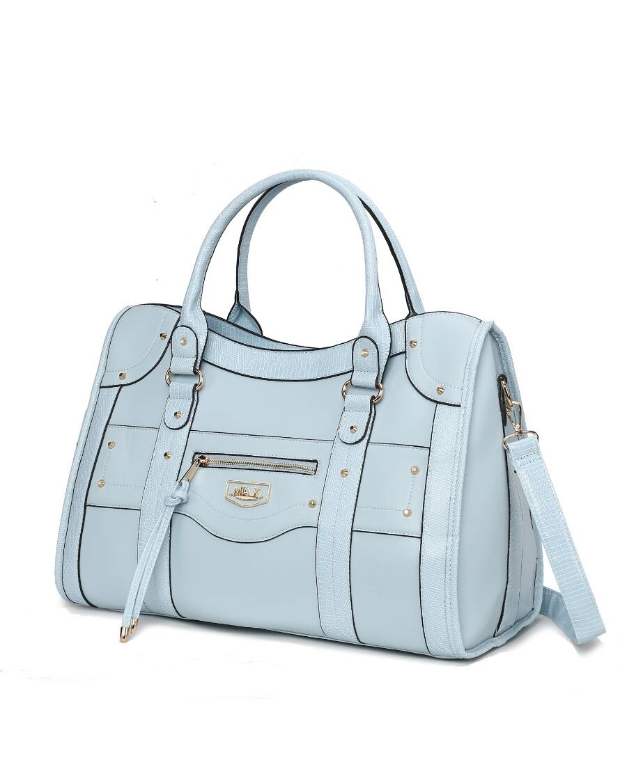 Presenting our Patricia Duffle Bag, a luxurious statement crafted from high-quality vegan leather with captivating faux snakeskin details. Designed for the fashion-forward traveler, it features top handles and a crossbody strap for versatile wear. Practicality meets style with a front zipper pocket and a trolley sleeve that hides a secure zipper pocket. Protective metal feet and a spacious, fully lined interior with pockets ensure durability and organization. Embellished with gold-tone studs, this bag exudes opulence and ethical consciousness, making it perfect for any journeyDETAILS - High-quality vegan leatherGold-tone hardware75” L x 12.25” H x 6.5” WFaux snakeskin and solid vegan leatherHandle Drop 6.5”Exterior details - front and back zip pocketsInterior details - wall zipper pocket and two slip in pocketsShoulder handle with an adjustable and removable shoulder strap extends to 48”Zipper fasteningTrolley sleeveDust Bag included