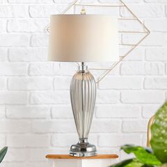 Bookend a shelf or console with an eye-catching pair of these beautiful blown-glass table lamps. The vibrantly hued glass bodies are gently curved, and the crisp white shades finish these lamps in classic style. A classic silver mercury-style glass makes this versatile set of two the perfect pair for any style of home decor.