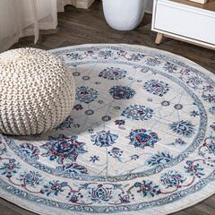 Layer on the cottage style with this colorful rug's all-over medallion design. The family-friendly pattern mixes navy and sky blue with a punch of orange for a vintage, Bohemian vibe. It's the perfect start to a vibrant color scheme in a bedroom, living room, entry, or dining area.