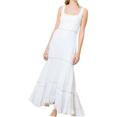 Style this maxi with your favorite statement necklace and sandals for the perfect look.Effortless elegance in stunning white maxi dress. Exudes sophistication with its classic square neckline and delicate straps. Fit and flare silhouette beautifully complements your figure. Fully lined, ruffled skirt adds a touch of whimsical charm. Designed for both comfort and style. Features a discreet zip closure at the back. Crafted from luxurious 100% linen with a soft rayon lining.