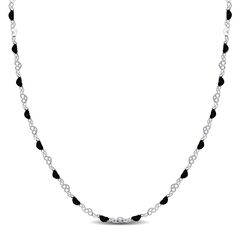 This necklace features black enamel beads and heart-shaped links on a sterling silver chain. It is designed as a station necklace, meaning that the beads and links are evenly spaced out along the chain. The necklace is 18 inches in length with a 1-inch extender, giving the option to adjust the length slightly.