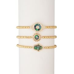 We love the dash of sparkle this piece brings to a look. Each bracelet is stunning enough to stand on its own and also look great in a set. Product Details - 3-piece bracelet set 14K gold plated brass CZ crystal evil eye and hamsa charms Adjustable chain