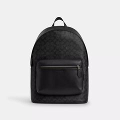 Signature coated canvas and smooth leather Two separate main compartments with zip closures Inside zip cell phone and multifunction pockets Fabric lining Top handle with 3 1/4 drop Outside zip pocket Adjustable shoulder straps 12 1/2 (L) x 16 3/4 (H) x 6 (W) Style No. CV922 | Coach Outlet West Backpack In Signature Canvas With Varsity Stripe - Black