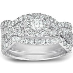 Womens quality diamond engagement wedding ring set features 97 round cut genuine diamonds. All diamonds are set in solid 10k white gold. This trio ring set features two matching bands that fit flush with the cushion halo engagement ring.