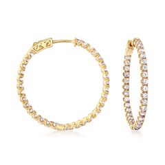 Developing fresh ways to wear timeless looks, Ross-Simons masters the classics. You’ll shine from all angle with our magnificent inside-outside hoop earrings! The pair glows with 3.63 ct. t.w. round brilliant-cut CZs set in luxurious 18kt yellow gold over sterling silver. A perfect choice for everyday wear! Hanging length is 1 3/8". Vault lock safety. Hinged post, CZ hoop earrings. CZ weights are diamond equivalents. Each Ross-Simons item arrives in a fine jewelry presentation box. Shop Ross-Simons jewelry risk-free as all items include a 30-day, 100% money-back guarantee.Stone InformationGem Type 1 - Cubic-ZirconiaStone Cut 1 - Good-CutStone Color 1 - ClearStone Clarity 1 - ClearStone Shape 1 - Round-ShapeStone Creation Method 1 - SyntheticStone Treatment Method 1 - Not-TreatedStone Weight 1 - 3.63 CaratsNumber Of Stones 1 - 66