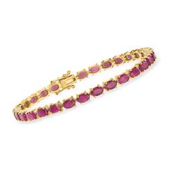 Ross-Simons is the authority on luxury classics. Embrace the bold beauty of deep red with this compelling ruby bracelet where 18.00 ct. t.w. oval rubies trail the wrist in 18kt yellow gold over sterling silver, a rich setting that furthers the warm glow of the gems. It's a gorgeous gemstone statement that would be especially lovely as a July birthstone piece. Double-latch safety. Box clasp, ruby bracelet. Each Ross-Simons item arrives in a fine jewelry presentation box. Shop Ross-Simons jewelry risk-free as all items include a 30-day, 100% money-back guarantee.Stone InformationGem Type 1 - RubyStone Cut 1 - Good-CutStone Color 1 - RedStone Clarity 1 - RedStone Shape 1 - Oval-ShapeStone Creation Method 1 - NaturalStone Treatment Method 1 - Heat-TreatedStone Weight 1 - 18.00-20.00 CaratsNumber Of Stones 1 - 28-32