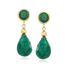 A top-rated jeweler since 1952, Ross-Simons travels the world to find high-quality styles at the best prices. Eye-popping green comes to life as 10.00 ct. t.w. emerald teardrop briolettes suspend gently from 2.00 ct. t.w. emerald rounds on this pair of 14kt yellow gold drop earrings. Hanging length is 7/8". Post/clutch, emerald drop earrings. Each Ross-Simons item arrives in a fine jewelry presentation box. Shop Ross-Simons jewelry risk-free as all items include a 30-day, 100% money-back guarantee.Stone InformationGem Type 1 - EmeraldStone Cut 1 - Good-CutStone Color 1 - GreenStone Clarity 1 - GreenStone Shape 1 - TeardropStone Creation Method 1 - NaturalStone Treatment Method 1 - OiledStone Weight 1 - 10.00 CaratsNumber Of Stones 1 - 2Gem Type 2 - EmeraldStone Cut 2 - Good-CutStone Color 2 - GreenStone Clarity 2 - GreenStone Shape 2 - Round-ShapeStone Creation Method 2 - NaturalStone Treatment Method 2 - OiledStone Weight 2 - 2.00 CaratsNumber Of Stones 2 - 2