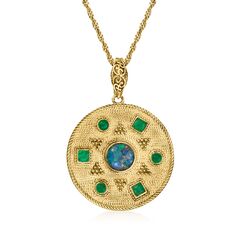 Ross-Simons is always looking for new ways to reinvent essential jewelry styles. Our spectacular medallion necklace is a perfect finishing touch to your layered look! The beaded 18kt yellow gold over sterling silver triangles create a subtle sun design between the glowing 3mm round and square green agates, enhancing the opulent 8mm black opal at the center. The unique opal flashes vibrant shades of black, green, blue and red, for a dramatic look. Singapore chain adjusts from choker length to 24", so you can suspend this artistic design in any way that suits your fancy! Lobster clasp, green agate and black opal sun medallion pendant necklace. Necklace drop length - 1 3/4 inches long. Necklace drop width - 1 1/4 inches wide. Each Ross-Simons item arrives in a fine jewelry presentation box. Shop Ross-Simons jewelry risk-free as all items include a 30-day, 100% money-back guarantee.Stone InformationGem Type 1 - AgateStone Cut 1 - CabochonStone Color 1 - GreenStone Clarity 1 - GreenStone Shape 1 - Round-ShapeStone Creation Method 1 - NaturalStone Treatment Method 1 - DyedStone Weight 1 - 0 CaratsNumber Of Stones 1 - 3Gem Type 2 - AgateStone Cut 2 - CabochonStone Color 2 - GreenStone Clarity 2 - GreenStone Shape 2 - Square-ShapeStone Creation Method 2 - NaturalStone Treatment Method 2 - DyedStone Weight 2 - 0 CaratsNumber Of Stones 2 - 3Gem Type 3 - OpalStone Cut 3 - CabochonStone Color 3 - BlackStone Clarity 3 - BlackStone Shape 3 - Special-Cut-ShapeStone Creation Method 3 - NaturalStone Treatment Method 3 - ImpregnatedStone Weight 3 - 0 CaratsNumber Of Stones 3 - 1