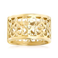 Ross-Simons presents contemporary styles with a timeless appeal. Perfect for your sweetheart, this romantic ring will complement all of her outfits! The Italian-made design glows with filigree hearts in polished 14kt yellow gold. 1/2" wide. 14kt yellow gold filigree heart ring. Each Ross-Simons item arrives in a fine jewelry presentation box. Shop Ross-Simons jewelry risk-free as all items include a 30-day, 100% money-back guarantee.