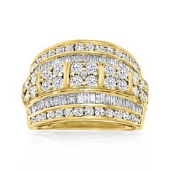 Ross-Simons travels the world to find beautiful, high-quality styles at the best prices. Stacked up in multiple rows, these diamonds make a lasting impression. The ring features 1.40 ct. t.w. round brilliant-cut and .60 ct. t.w. baguette diamonds. Includes both channel and prong settings. Center two rows are raised. Set in 18kt yellow gold over sterling silver. 5/8" wide. Diamond ring. Each Ross-Simons item arrives in a fine jewelry presentation box. Shop Ross-Simons jewelry risk-free as all items include a 30-day, 100% money-back guarantee.Stone InformationGem Type 1 - DiamondStone Cut 1 - Good-CutStone Color 1 - I-JStone Clarity 1 - I3Stone Shape 1 - Round-ShapeStone Creation Method 1 - NaturalStone Treatment Method 1 - Not-TreatedStone Weight 1 - 1.40 CaratsNumber Of Stones 1 - 53Gem Type 2 - DiamondStone Cut 2 - Good-CutStone Color 2 - I-JStone Clarity 2 - I3Stone Shape 2 - Baguette-ShapeStone Creation Method 2 - NaturalStone Treatment Method 2 - Not-TreatedStone Weight 2 - 0.60 CaratsNumber Of Stones 2 - 48