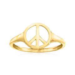 A top-rated jeweler since 1952, Ross-Simons travels the world to find high-quality styles at the best prices. Spread peace with this meaningful ring. Stylish and symbolic, the classic peace sign shines in polished 14kt yellow gold. 3/8" wide. 14kt yellow gold peace sign ring. Each Ross-Simons item arrives in a fine jewelry presentation box. Shop Ross-Simons jewelry risk-free as all items include a 30-day, 100% money-back guarantee.