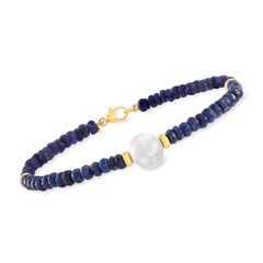 Ross-Simons is the authority on luxury classics. Our bracelet features 28.00 ct. t.w. sapphire beads and a lush 9-10mm cultured freshwater pearl center, creating quite an impression! Set in polished 14kt yellow gold. Lobster clasp, white pearl and sapphire bracelet. Each Ross-Simons item arrives in a fine jewelry presentation box. Shop Ross-Simons jewelry risk-free as all items include a 30-day, 100% money-back guarantee.Stone InformationGem Type 1 - SapphireStone Cut 1 - Good-CutStone Color 1 - BlueStone Clarity 1 - BlueStone Shape 1 - Round-ShapeStone Creation Method 1 - NaturalStone Treatment Method 1 - HeatedStone Weight 1 - 22.00-25.00 CaratsNumber Of Stones 1 - 0Pearl InformationPearl Type 1 - Freshwater-CulturedPearl Minimum Color 1 - WhitePearl Lustre 1 - Medium-LusterPearl Shape 1 - Semi-RoundPearl Uniformity 1 - GoodPearl Surface Blemishes 1 - Moderately BlemishedPearl Stringing Method 1 - Moderately BlemishedSize Per Pearl 1 - 9-10mmNumber Of Pearls 1 - 1