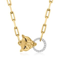 A top-rated jeweler since 1952, Ross-Simons travels the world to find high-quality styles at the best prices. Show off your wilder side with our fierce design! A roaring panther head shines in polished 18kt yellow gold over sterling silver with black diamond-accented eyes in black rhodium, gleaming at the bottom of an on-trend strand of paper clip links. Note the cleverly concealed box clasp, which functions by pressing the push button to first release and then secure the 0.14 ct. t.w. diamond open circle to the panther head. White rhodium at white diamonds. Diamond panther paper clip link necklace. Each Ross-Simons item arrives in a fine jewelry presentation box. Shop Ross-Simons jewelry risk-free as all items include a 30-day, 100% money-back guarantee.Stone InformationGem Type 1 - Diamond-ColoredStone Cut 1 - Good-CutStone Color 1 - BlackStone Clarity 1 - I2Stone Shape 1 - Round-ShapeStone Creation Method 1 - Round-ShapeStone Treatment Method 1 - Round-ShapeStone Weight 1 - 0.01 CaratsNumber Of Stones 1 - 2Gem Type 2 - DiamondStone Cut 2 - Good-CutStone Color 2 - I-JStone Clarity 2 - I2Stone Shape 2 - Round-ShapeStone Creation Method 2 - NaturalStone Treatment Method 2 - Not-TreatedStone Weight 2 - 0.07 CaratsNumber Of Stones 2 - 6Gem Type 3 - DiamondStone Cut 3 - Good-CutStone Color 3 - I-JStone Clarity 3 - I2Stone Shape 3 - Round-ShapeStone Creation Method 3 - NaturalStone Treatment Method 3 - Not-TreatedStone Weight 3 - 0.07 CaratsNumber Of Stones 3 - 12