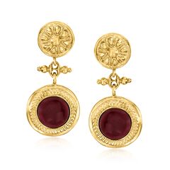 Ross-Simons travels the world to find beautiful, high-quality styles at the best prices. From Italy, these richly-hued earrings are astonishing. Warm 6.50 ct. t.w. garnet cabochons glow in floral-detailed 18kt yellow gold over sterling silver. Polished finish. Hanging length is 1 1/2". Post/clutch, garnet drop earrings. Each Ross-Simons item arrives in a fine jewelry presentation box. Shop Ross-Simons jewelry risk-free as all items include a 30-day, 100% money-back guarantee.Stone InformationGem Type 1 - GarnetStone Cut 1 - CabochonStone Color 1 - RedStone Clarity 1 - RedStone Shape 1 - Round-ShapeStone Creation Method 1 - NaturalStone Treatment Method 1 - Not-TreatedStone Weight 1 - 6.50 CaratsNumber Of Stones 1 - 2