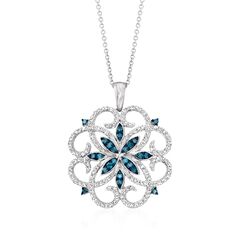 Ross-Simons presents contemporary styles with a timeless appeal. Imbued with the romance of an antique, this scrolling medallion pendant necklace is glistening with 0.76 ct. t.w. white and treated blue diamonds. Suspends from a cable chain with a lobster clasp. Our blue diamonds are natural diamonds that have been treated which causes the color change and then heated to hold the color. The color change process is permanent. Sterling silver pendant necklace. Necklace drop length - 1 1/8 inches long. Necklace drop width - 1 inch wide. Each Ross-Simons item arrives in a fine jewelry presentation box. Shop Ross-Simons jewelry risk-free as all items include a 30-day, 100% money-back guarantee.Stone InformationGem Type 1 - DiamondStone Cut 1 - Good-CutStone Color 1 - I-JStone Clarity 1 - I2Stone Shape 1 - Round-ShapeStone Creation Method 1 - NaturalStone Treatment Method 1 - Not-TreatedStone Weight 1 - 0.52 CaratsNumber Of Stones 1 - 132Gem Type 2 - DiamondStone Cut 2 - Good-CutStone Color 2 - BlueStone Clarity 2 - I2Stone Shape 2 - Round-ShapeStone Creation Method 2 - NaturalStone Treatment Method 2 - Not-TreatedStone Weight 2 - 0.24 CaratsNumber Of Stones 2 - 24