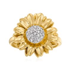 At Ross-Simons, we recognize the style power of versatile classics. Brighten your day when you don this sunflower ring. The cheery design features 0.25 ct. t.w. round brilliant-cut diamonds in white rhodium with polished 18kt yellow gold over sterling silver petals. 3/4" wide. Diamond sunflower ring. Each Ross-Simons item arrives in a fine jewelry presentation box. Shop Ross-Simons jewelry risk-free as all items include a 30-day, 100% money-back guarantee.Stone InformationGem Type 1 - DiamondStone Cut 1 - Good-CutStone Color 1 - I-JStone Clarity 1 - I2Stone Shape 1 - Round-ShapeStone Creation Method 1 - NaturalStone Treatment Method 1 - Not-TreatedStone Weight 1 - 0.25 CaratsNumber Of Stones 1 - 19
