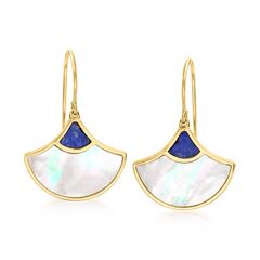 Ross-Simons presents contemporary styles with a timeless appeal. Artful and unique, our fan drop earrings present iridescent 17x8mm carved mother-of-pearl and expressive 6x5mm carved lapis. Set in polished 18kt yellow gold over sterling silver. Natural pyrite details of lapis will vary. Hanging length is 1". Earwire, lapis and mother-of-pearl fan drop earrings. Each Ross-Simons item arrives in a fine jewelry presentation box. Shop Ross-Simons jewelry risk-free as all items include a 30-day, 100% money-back guarantee.Stone InformationGem Type 1 - Lapis-LazuliStone Cut 1 - Good-CutStone Color 1 - BlueStone Clarity 1 - BlueStone Shape 1 - Special-Cut-ShapeStone Creation Method 1 - NaturalStone Treatment Method 1 - DyedStone Weight 1 - 0 CaratsNumber Of Stones 1 - 2Gem Type 2 - Mother Of PearlStone Cut 2 - Good-CutStone Color 2 - WhiteStone Clarity 2 - WhiteStone Shape 2 - Special-Cut-ShapeStone Creation Method 2 - NaturalStone Treatment Method 2 - Dyed, CoatedStone Weight 2 - 0 CaratsNumber Of Stones 2 - 2