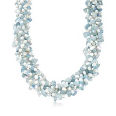 Established in 1952, Ross-Simons presents contemporary styles with a timeless appeal. An RS exclusive. Milky aquamarine nuggets twist with 5-6mm semi-baroque blue cultured freshwater pearls in this sensational torsade necklace. Toss this on for an instant fun, fresh look. Necklace finishes with sterling silver lobster clasp and 3" extender. Each Ross-Simons item arrives in a fine jewelry presentation box. Shop Ross-Simons jewelry risk-free as all items include a 30-day, 100% money-back guarantee.Stone InformationGem Type 1 - AquamarineStone Cut 1 - Good-CutStone Color 1 - BlueStone Clarity 1 - BlueStone Shape 1 - Special-Cut-ShapeStone Creation Method 1 - NaturalStone Treatment Method 1 - Heat-TreatedStone Weight 1 - 850.00 CaratsNumber Of Stones 1 - 0Pearl InformationPearl Type 1 - Freshwater-CulturedPearl Minimum Color 1 - Dyed-BluePearl Lustre 1 - Medium-LusterPearl Shape 1 - Semi-BaroquePearl Uniformity 1 - GoodPearl Surface Blemishes 1 - Moderately BlemishedPearl Stringing Method 1 - Moderately BlemishedSize Per Pearl 1 - 5-6mmNumber Of Pearls 1 - 5-6mm