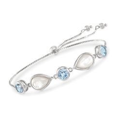 Developing fresh ways to wear timeless looks, Ross-Simons masters the classics. Bright pops of 6.00 ct. t.w. blue topaz alternate with 8x12mm pear-shaped mother-of-pearl cabochons to create this on-trend bolo bracelet. Set on a polished sterling silver box chain with 4mm beads dangling from the ends. 6mm sliding mechanism adjusts to fit most wrists. Mother-of-pearl and blue topaz bolo bracelet. Each Ross-Simons item arrives in a fine jewelry presentation box. Shop Ross-Simons jewelry risk-free as all items include a 30-day, 100% money-back guarantee.Stone InformationGem Type 1 - Mother Of PearlStone Cut 1 - CabochonStone Color 1 - WhiteStone Clarity 1 - WhiteStone Shape 1 - Pear-ShapeStone Creation Method 1 - NaturalStone Treatment Method 1 - Dyed, CoatedStone Weight 1 - 0 CaratsNumber Of Stones 1 - 2Gem Type 2 - TopazStone Cut 2 - Rose-CutStone Color 2 - BlueStone Clarity 2 - BlueStone Shape 2 - Round-ShapeStone Creation Method 2 - NaturalStone Treatment Method 2 - Heat-Treated,IrradiatedStone Weight 2 - 6.00 CaratsNumber Of Stones 2 - 3