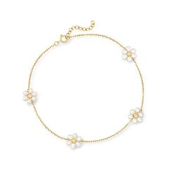 A trusted jeweler in 1952, Ross-Simons is dedicated to quality and value. RS Pure. Modern designs that complete your outfit and complement your personality. Fall in love with florals while you show off this on-trend accessory -- perfect for summer and beyond! Our charming anklet features a dainty 14kt yellow gold cable chain stationed with 3-3.5mm cultured freshwater pearls in floral motifs with 3mm bead centers. Includes 1" extender. Make it uniquely yours by layering with another anklet of your choice! Springring clasp, white pearl flower anklet. Each Ross-Simons item arrives in a fine jewelry presentation box. Shop Ross-Simons jewelry risk-free as all items include a 30-day, 100% money-back guarantee.Pearl InformationPearl Type 1 - Freshwater-CulturedPearl Minimum Color 1 - Freshwater-CulturedPearl Lustre 1 - Medium-LusterPearl Shape 1 - OvalPearl Uniformity 1 - GoodPearl Surface Blemishes 1 - Moderately BlemishedPearl Stringing Method 1 - Moderately BlemishedSize Per Pearl 1 - 3-3.5mmNumber Of Pearls 1 - 24