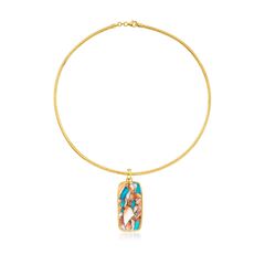 Ross-Simons is the authority on luxury classics. An alluring array of colors blends into a mesmerizing mosaic, creating our impressive Kingman turquoise pendant. Perfectly paired with an omega chain in 18kt yellow gold over sterling silver, our eye-catching design adds a bold touch and a hint of mystique to every outfit. Polished finish. Lobster clasp, Kingman turquoise necklace. Necklace drop length - 2 3/8 inches long. Necklace drop width - 7/8 inch wide. Each Ross-Simons item arrives in a fine jewelry presentation box. Shop Ross-Simons jewelry risk-free as all items include a 30-day, 100% money-back guarantee.Stone InformationGem Type 1 - ShellStone Cut 1 - Good-CutStone Color 1 - Multiple-ColorsStone Clarity 1 - Multiple-ColorsStone Shape 1 - Special-Cut-ShapeStone Creation Method 1 - NaturalStone Treatment Method 1 - Dyed, CoatedStone Weight 1 - 0 CaratsNumber Of Stones 1 - 0Gem Type 2 - Stabilized-TurquoiseStone Cut 2 - Good-CutStone Color 2 - BlueStone Clarity 2 - BlueStone Shape 2 - Special-Cut-ShapeStone Creation Method 2 - NaturalStone Treatment Method 2 - Dyed, StabilizedStone Weight 2 - 0 CaratsNumber Of Stones 2 - 0