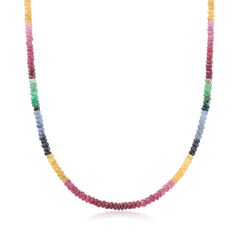 A top-rated jeweler since 1952, Ross-Simons travels the world to find high-quality styles at the best prices. This eye-catching 80.00 ct. t.w. multicolored sapphire bead necklace is fashionable and oh so fun! Over 180 rondelle faceted beads create an ombre-inspired rainbow strand that will look fantastic year-round, but especially chic with a warmer-weather wardrobe. Finishes with a 14kt yellow gold magnetic clasp for easy on-and-off. Multicolored sapphire bead necklace. Each Ross-Simons item arrives in a fine jewelry presentation box. Shop Ross-Simons jewelry risk-free as all items include a 30-day, 100% money-back guarantee.Stone InformationGem Type 1 - SapphireStone Cut 1 - Good-CutStone Color 1 - Multiple-ColorsStone Clarity 1 - Multiple-ColorsStone Shape 1 - Special-Cut-ShapeStone Creation Method 1 - NaturalStone Treatment Method 1 - HeatedStone Weight 1 - 80.00 CaratsNumber Of Stones 1 - 188