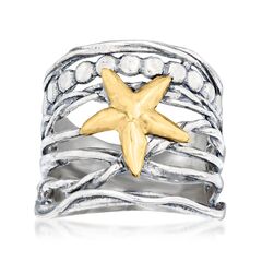 Developing fresh ways to wear timeless looks, Ross-Simons masters the classics. Presenting the sweetest ring straight from the sea! Here, multiple rows of textured, polished and oxidized sterling silver are topped with a splendid 14kt yellow gold starfish. 3/4" wide. Sterling silver and 14kt yellow gold starfish ring. Each Ross-Simons item arrives in a fine jewelry presentation box. Shop Ross-Simons jewelry risk-free as all items include a 30-day, 100% money-back guarantee.