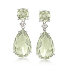 Ross-Simons is always looking for new ways to reinvent essential jewelry styles. Glamorous pastel green gems will illuminate your face from ear to ear! On this pair, 21.60 ct. t.w. square cushion-cut and pear-shaped prasiolites glimmer a verdant glow, sparked by diamond accents and set in polished sterling silver. Hanging length is 1 1/8". Post/clutch, prasiolite drop earrings. Each Ross-Simons item arrives in a fine jewelry presentation box. Shop Ross-Simons jewelry risk-free as all items include a 30-day, 100% money-back guarantee.Stone InformationGem Type 1 - Prasiolite-QuartzStone Cut 1 - Good-CutStone Color 1 - GreenStone Clarity 1 - GreenStone Shape 1 - Pear-ShapeStone Creation Method 1 - NaturalStone Treatment Method 1 - IrradiatedStone Weight 1 - 18.00 CaratsNumber Of Stones 1 - 2Gem Type 2 - Prasiolite-QuartzStone Cut 2 - Good-CutStone Color 2 - GreenStone Clarity 2 - GreenStone Shape 2 - Square-ShapeStone Creation Method 2 - NaturalStone Treatment Method 2 - IrradiatedStone Weight 2 - 3.60 CaratsNumber Of Stones 2 - 2Gem Type 3 - DiamondStone Cut 3 - Good-CutStone Color 3 - G-HStone Clarity 3 - I2Stone Shape 3 - Round-ShapeStone Creation Method 3 - NaturalStone Treatment Method 3 - Not-TreatedStone Weight 3 - 0.03 CaratsNumber Of Stones 3 - 2