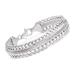 Ross-Simons travels the world to find beautiful, high-quality styles at the best prices. Our sterling silver bracelet from Italy. This bracelet was made for mixing and matching. In brushed and polished sterling silver, a mesh center is framed with classic curb links for a bold and elegant fusion. Worn alone or stacked, this bracelet is a chic addition to any look. 3/8" wide. Lobster clasp, sterling silver curb-link bracelet. Each Ross-Simons item arrives in a fine jewelry presentation box. Shop Ross-Simons jewelry risk-free as all items include a 30-day, 100% money-back guarantee.
