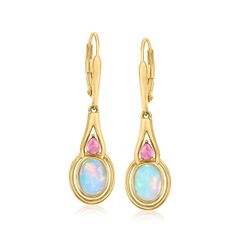 Ross-Simons is the authority on fashionable must-haves. Add a mystical touch to your outfit with these drop earrings. Here, 6x8mm oval Ethiopian opal cabochons beam next to .30 ct. t.w. pear-shaped pink tourmaline cabochons. Set in polished 18kt yellow gold over sterling silver. Hanging length is 1 3/8". Leverback, pink tourmaline and Ethiopian opal drop earrings. Each Ross-Simons item arrives in a fine jewelry presentation box. Shop Ross-Simons jewelry risk-free as all items include a 30-day, 100% money-back guarantee.Stone InformationGem Type 1 - OpalStone Cut 1 - CabochonStone Color 1 - WhiteStone Clarity 1 - WhiteStone Shape 1 - Oval-ShapeStone Creation Method 1 - NaturalStone Treatment Method 1 - ImpregnatedStone Weight 1 - 0 CaratsNumber Of Stones 1 - 2Gem Type 2 - TourmalineeStone Cut 2 - CabochonStone Color 2 - PinkStone Clarity 2 - PinkStone Shape 2 - Pear-ShapeStone Creation Method 2 - NaturalStone Treatment Method 2 - Heated, IrradiatedStone Weight 2 - 0.30 CaratsNumber Of Stones 2 - 2