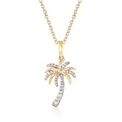 Ross-Simons is the authority on luxury classics. Take a trip to the tropics -- no plane ticket required. This palm tree pendant necklace dazzles and sways with .10 ct. t.w. diamonds. Complete the look with the matching earrings (916762). Set in 14kt yellow gold on a cable chain with 2" extender. Springring clasp, diamond palm tree necklace. Necklace drop length - 7/8 inch long. Necklace drop width - 3/8 inch wide. Each Ross-Simons item arrives in a fine jewelry presentation box. Shop Ross-Simons jewelry risk-free as all items include a 30-day, 100% money-back guarantee.Stone InformationGem Type 1 - DiamondStone Cut 1 - Good-CutStone Color 1 - I-JStone Clarity 1 - I2Stone Shape 1 - Round-ShapeStone Creation Method 1 - NaturalStone Treatment Method 1 - Not-TreatedStone Weight 1 - 0.10 CaratsNumber Of Stones 1 - 32