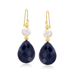 Established in 1952, Ross-Simons brings jewelry classics into the modern era. Three traditional treasures come together in a classy pair of earrings - 20.00 ct. t.w. faceted, pear-shaped sapphire, 6-7mm cultured freshwater pearls, and 14kt yellow gold beads. Hanging length is 1 3/8". Earwire, 14kt yellow gold earrings. Each Ross-Simons item arrives in a fine jewelry presentation box. Shop Ross-Simons jewelry risk-free as all items include a 30-day, 100% money-back guarantee.Stone InformationGem Type 1 - SapphireStone Cut 1 - Good-CutStone Color 1 - BlueStone Clarity 1 - BlueStone Shape 1 - Pear-ShapeStone Creation Method 1 - NaturalStone Treatment Method 1 - HeatedStone Weight 1 - 20.00 CaratsNumber Of Stones 1 - 2Pearl InformationPearl Type 1 - Freshwater-CulturedPearl Minimum Color 1 - WhitePearl Lustre 1 - Medium-LusterPearl Shape 1 - Semi-RoundPearl Uniformity 1 - GoodPearl Surface Blemishes 1 - Moderately BlemishedPearl Stringing Method 1 - Moderately BlemishedSize Per Pearl 1 - 6-7mmNumber Of Pearls 1 - 2