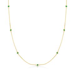 Ross-Simons is the authority on fashionable must-haves. RS Pure. Modern designs that complete your outfit and complement your personality. When your layers need a pop of color, add this chic necklace to the mix! It features 0.20 ct. t.w. emerald rounds stationed along a cable chain in polished 14kt yellow gold. Includes a 2" extender. Springring clasp, emerald station necklace. Each Ross-Simons item arrives in a fine jewelry presentation box. Shop Ross-Simons jewelry risk-free as all items include a 30-day, 100% money-back guarantee.Stone InformationGem Type 1 - EmeraldStone Cut 1 - Good-CutStone Color 1 - GreenStone Clarity 1 - GreenStone Shape 1 - Round-ShapeStone Creation Method 1 - NaturalStone Treatment Method 1 - OiledStone Weight 1 - 0.20 CaratsNumber Of Stones 1 - 7