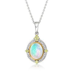 With a commitment to quality and affordability, Ross-Simons presents timeless jewelry for the modern woman. Indulge in the beautiful color play of opal. This pendant necklace features an 8x10mm oval Ethiopian opal cabochon highlighted by 0.10 ct. t.w. round brilliant-cut diamonds and .18 ct. t.w. round peridots. Set in polished sterling silver with 14kt yellow gold circling the opal. Suspends from a cable chain. Lobster clasp, peridot, diamond and Ehiopian opal pendant necklace. Necklace drop length - 1 inch long. Necklace drop width - 9/16 inch wide. Each Ross-Simons item arrives in a fine jewelry presentation box. Shop Ross-Simons jewelry risk-free as all items include a 30-day, 100% money-back guarantee.Stone InformationGem Type 1 - OpalStone Cut 1 - CabochonStone Color 1 - WhiteStone Clarity 1 - WhiteStone Shape 1 - Oval-ShapeStone Creation Method 1 - NaturalStone Treatment Method 1 - ImpregnatedStone Weight 1 - 0 CaratsNumber Of Stones 1 - 1Gem Type 2 - PeridotStone Cut 2 - Good-CutStone Color 2 - GreenStone Clarity 2 - GreenStone Shape 2 - Round-ShapeStone Creation Method 2 - NaturalStone Treatment Method 2 - Not-TreatedStone Weight 2 - 0.18 CaratsNumber Of Stones 2 - 7Gem Type 3 - DiamondStone Cut 3 - Good-CutStone Color 3 - H-IStone Clarity 3 - I3Stone Shape 3 - Round-ShapeStone Creation Method 3 - NaturalStone Treatment Method 3 - Not-TreatedStone Weight 3 - 0.10 CaratsNumber Of Stones 3 - 24