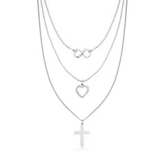 Developing fresh ways to wear timeless looks, Ross-Simons masters the classics. Layer on the significance of our Italian-made necklace. Three polished sterling silver pendants - infinity sign, heart and cross - serve as steadfast reminders that faith and love are forever. Makes a meaningful gift to lift a loved one's spirits. Includes 16" rolo, 18" bead and 20" curb chain layers with a 2" extender. Lobster clasp, sterling silver symbol layered necklace. Necklace drop length - 1 inch long. Necklace drop width - 5/8 inch wide. Each Ross-Simons item arrives in a fine jewelry presentation box. Shop Ross-Simons jewelry risk-free as all items include a 30-day, 100% money-back guarantee.