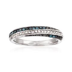 Developing fresh ways to wear timeless looks, Ross-Simons masters the classics. Our modern band ring is striped with a bold blend of 0.18 ct. t.w. white and blue diamonds in polished sterling silver with black rhodium. 3/16" wide. Our blue diamonds are natural diamonds that have been treated which causes the color change and then heated to hold the color. The color change process is permanent. White and blue diamond ring. Each Ross-Simons item arrives in a fine jewelry presentation box. Shop Ross-Simons jewelry risk-free as all items include a 30-day, 100% money-back guarantee.Stone InformationGem Type 1 - DiamondStone Cut 1 - Good-CutStone Color 1 - BlueStone Clarity 1 - I1Stone Shape 1 - Round-ShapeStone Creation Method 1 - NaturalStone Treatment Method 1 - Not-TreatedStone Weight 1 - 0.12 CaratsNumber Of Stones 1 - 15Gem Type 2 - DiamondStone Cut 2 - Good-CutStone Color 2 - H-IStone Clarity 2 - I2Stone Shape 2 - Round-ShapeStone Creation Method 2 - NaturalStone Treatment Method 2 - Not-TreatedStone Weight 2 - 0.06 CaratsNumber Of Stones 2 - 9