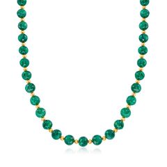 Ross-Simons presents contemporary styles with a timeless appeal. This necklace is a gorgeous display of elegant emeralds! An impressive collection of 210.00 ct. t.w. round faceted emerald beads glow a verdant green among 4mm 14kt yellow gold spacer beads. Springring clasp, emerald bead necklace. Each Ross-Simons item arrives in a fine jewelry presentation box. Shop Ross-Simons jewelry risk-free as all items include a 30-day, 100% money-back guarantee.Stone InformationGem Type 1 - EmeraldStone Cut 1 - Good-CutStone Color 1 - GreenStone Clarity 1 - GreenStone Shape 1 - Round-ShapeStone Creation Method 1 - NaturalStone Treatment Method 1 - OiledStone Weight 1 - 210.00-235.00 CaratsNumber Of Stones 1 - 35-39