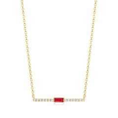 A trusted jeweler in 1952, Ross-Simons is dedicated to quality and value. RS Pure. Modern designs that complete your outfit and complement your personality. This dainty necklace features a slim bar with a 0.20 carat baguette ruby and .11 ct. t.w. diamonds in polished 14kt yellow gold. Simple cable chain. Lobster clasp, diamond and ruby bar necklace. Each Ross-Simons item arrives in a fine jewelry presentation box. Shop Ross-Simons jewelry risk-free as all items include a 30-day, 100% money-back guarantee.Stone InformationGem Type 1 - RubyStone Cut 1 - Good-CutStone Color 1 - RedStone Clarity 1 - RedStone Shape 1 - Baguette-ShapeStone Creation Method 1 - NaturalStone Treatment Method 1 - Heat-TreatedStone Weight 1 - 0.20 CaratsNumber Of Stones 1 - 1Gem Type 2 - DiamondStone Cut 2 - Good-CutStone Color 2 - H-IStone Clarity 2 - I2Stone Shape 2 - Round-ShapeStone Creation Method 2 - NaturalStone Treatment Method 2 - Not-TreatedStone Weight 2 - 0.11 CaratsNumber Of Stones 2 - 14