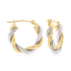 Established in 1952, Ross-Simons brings jewelry classics into the modern era. Cabled 14kt white gold entwines with polished 14kt yellow gold in this twisted pair of hoop earrings. Hanging length is 5/8". Snap-bar, 14kt two-tone gold earrings. Each Ross-Simons item arrives in a fine jewelry presentation box. Shop Ross-Simons jewelry risk-free as all items include a 30-day, 100% money-back guarantee.