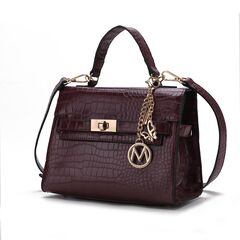 A pragmatic yet statement-making accessory, our Naomi satchel is an instant icon. Crafted from luxe crocodile-embossed vegan leather and silver-tone hardware for a polished finish, you will love this refined structured style. It features side gussets and when you open the turn lock closure, it will reveal an interior where you will easily hold a day’s worth of essentials, with a wall zip pocket and a slip pocket. The exterior is accented with a beautiful keychain with our round M emblem on it and it features a back zippered pocket. Detach the adjustable crossbody strap to carry it by the top handle when the mood strikes. The Naomi Satchel bag has a flat base and feet for stability. POCKETS - Interior features a wall zip pocket, two slip pockets. Exterior features two side zippered pockets, two front zippered pockets, a zippered pocket on the flap and a back zippered pocket Measurements - 9.8” W x 7” H x 4” D Handle Drop - 4” Adjustable and removable Crossbody strap - 23”- 27”